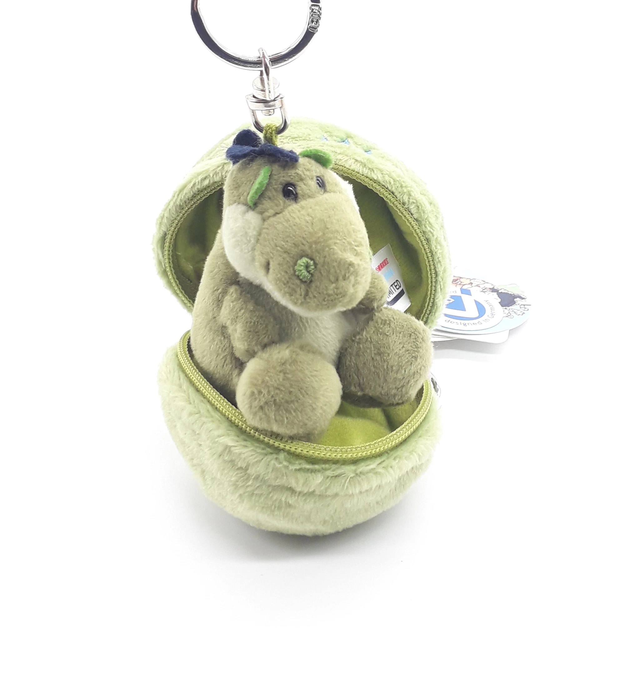 Der kleine Dinosaurier befindet sich im Inneren des Eies. Er ist leicht am Ei befestigt, damit er nicht herausfallen kann. Das Ei lässt sich mittels Reißverschluss öffnen.